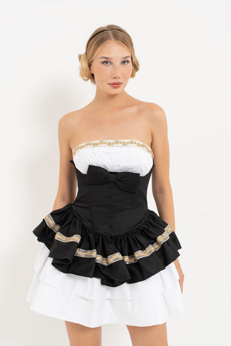 Off-White & Black Tiered Ruffle Bow Strapless Mini Dress