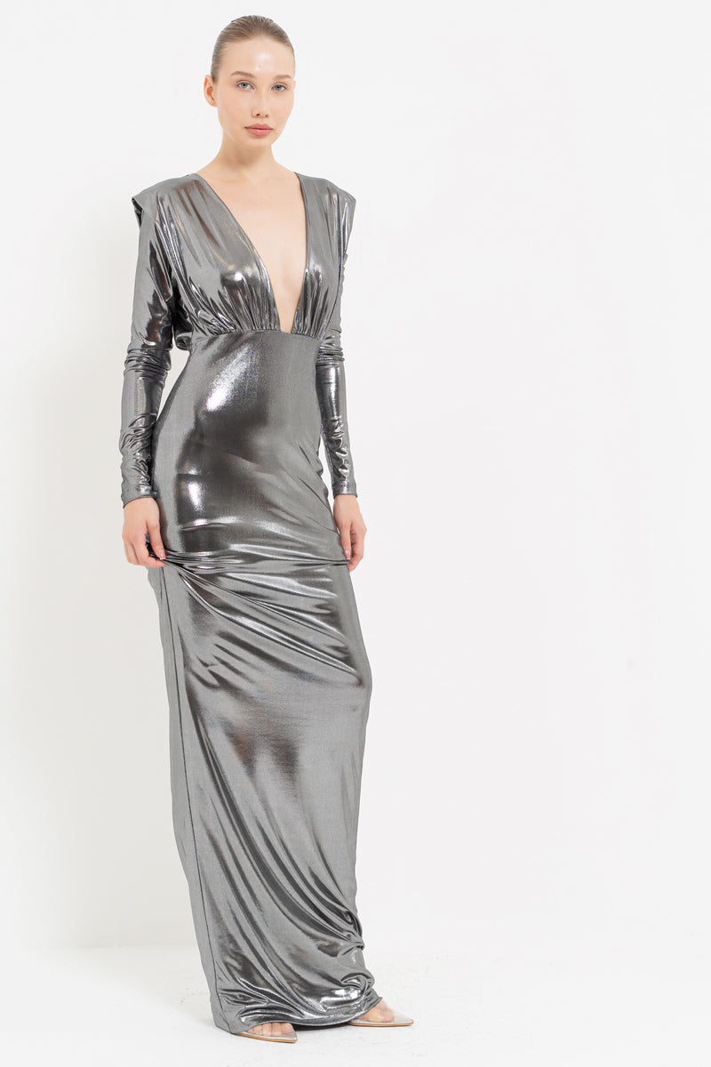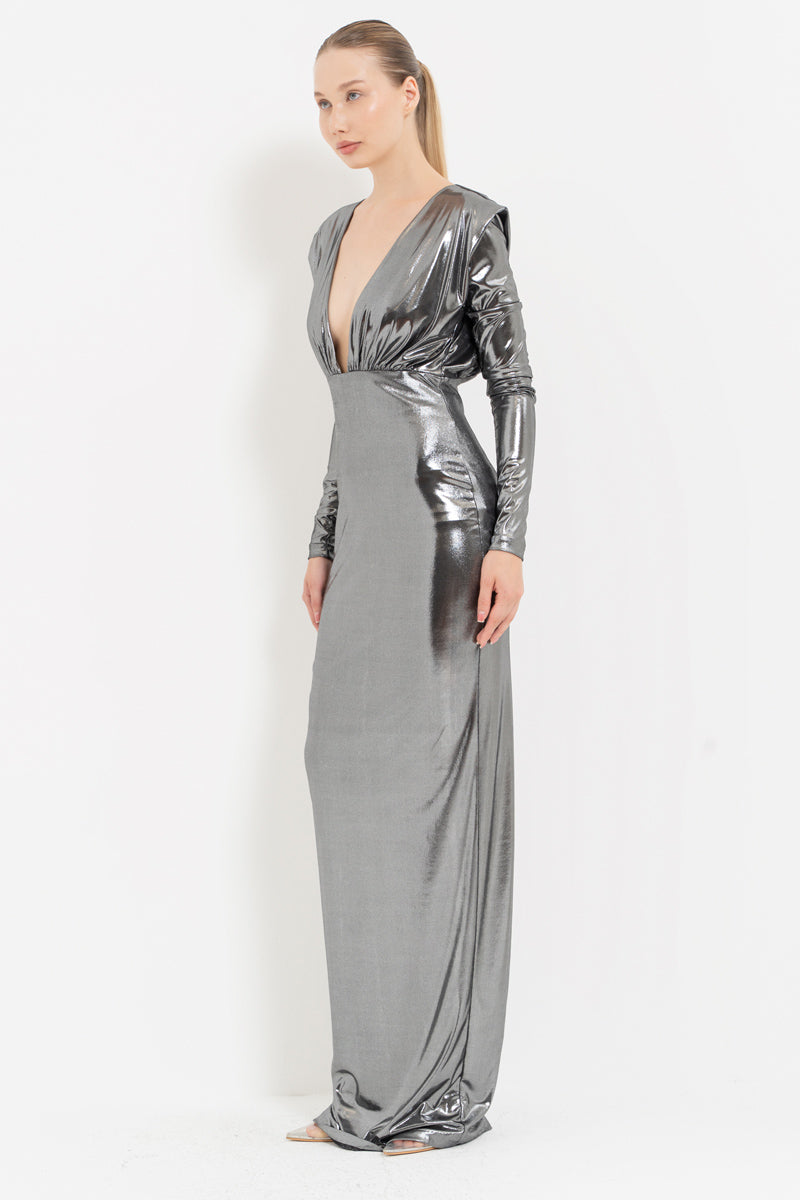 Silver V-Neck Cut-Out Shimmer Maxi Dress