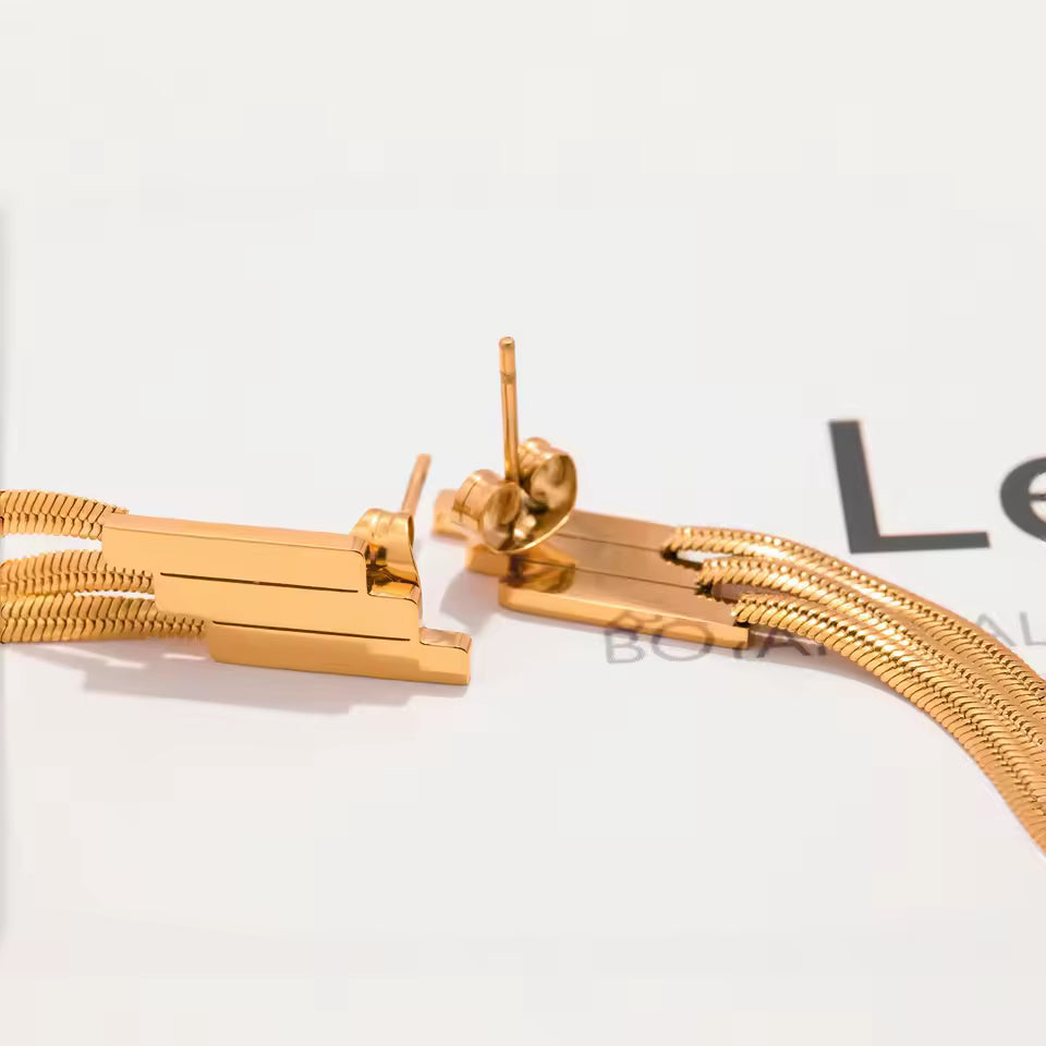 Dance with every step (81 × 7.5 mm) in these three-layer geometric tassel chain earrings, crafted from 316L stainless steel with 18K PVD gold plating, weighing just 5.2 g. Waterproof, non-tarnish, and hypoallergenic, they’re gentle on sensitive skin. Lightweight and lively, each layer sways playfully, adding dynamic charm and a touch of whimsy to any outfit.