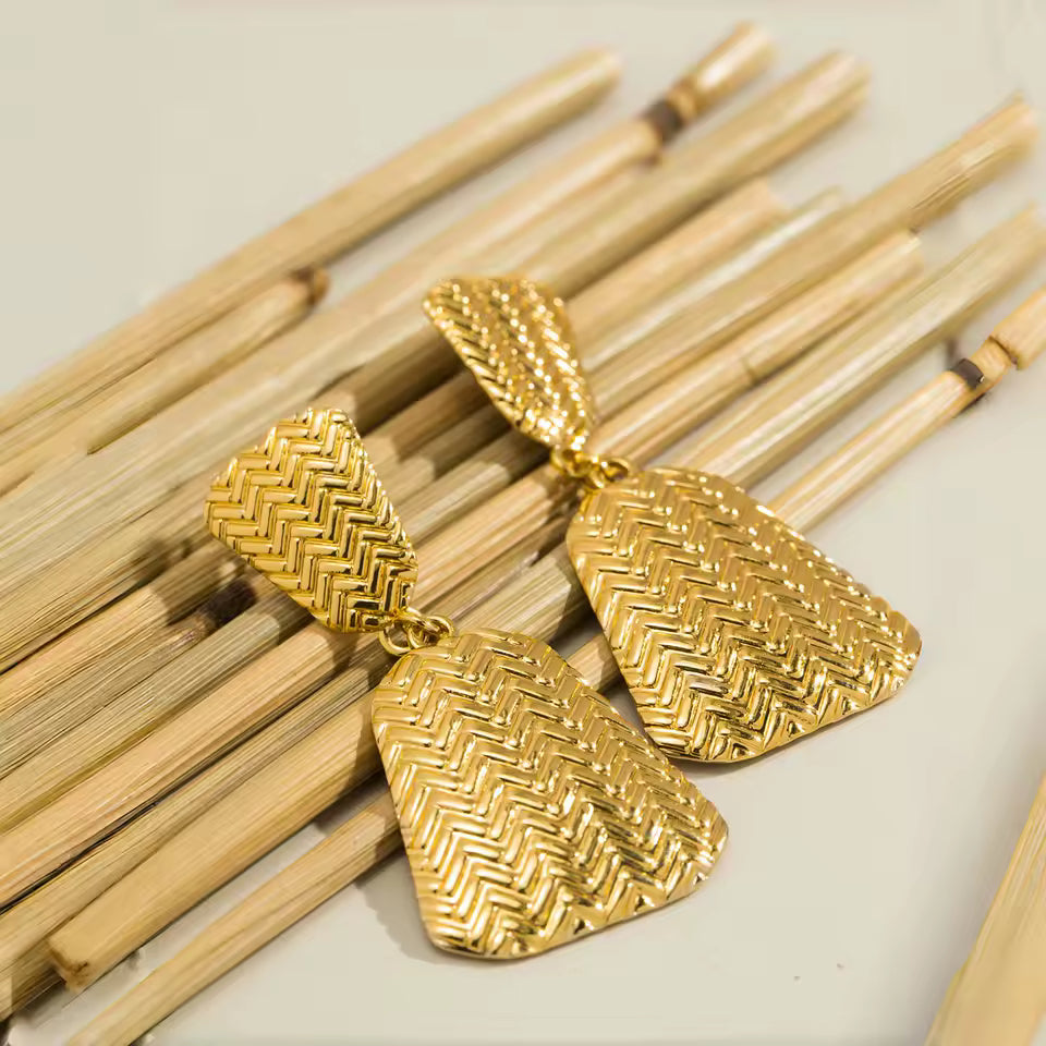 Bold and modern (55 x 25 mm), these trapezoid pendant dangle earrings are crafted from 316L stainless steel with 18K PVD gold plating, weighing 12.8 g. Waterproof, non-tarnish, and hypoallergenic, they’re gentle on sensitive skin. Sleek yet playful, they swing with every move, adding a dash of contemporary charm and effortless personality to any outfit.